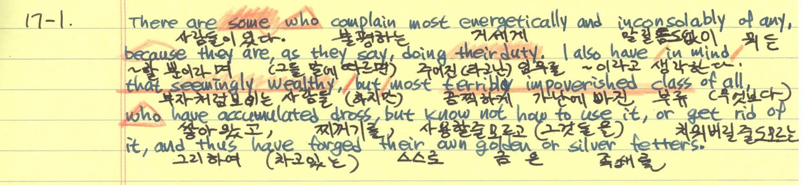 * "월든" 원서로 읽기 이제 겨우 11일째다. 이제 겨우 10여 쪽 읽었을 뿐인데 이게 영어구나 라는 생각이 든다. 학교에서 배운 모든 문법 사항들이 동원되어 있다. 수동태, 가정법, 양보구문, 도치구문 등의 문장 형식과 구조는 물론 비유, 상징, 풍자, 조소등의 표현기법 들, 그 시대의 사회와 인식 수준들이 가득하다. 그러느라 한쪽 분량 읽는데 두시간은 족히 걸리는 것 같다. 혼자 읽기 어렵다. 그래서 어느 번역판을 참고해가며 한줄 한줄 대조해 본다. 큰 도움이 되고 있다. 번역본은 원문의 느낌이 살아나지 않는 것 같다. 번역에 동의 못할 부분도 군데 군데 눈에 띈다.